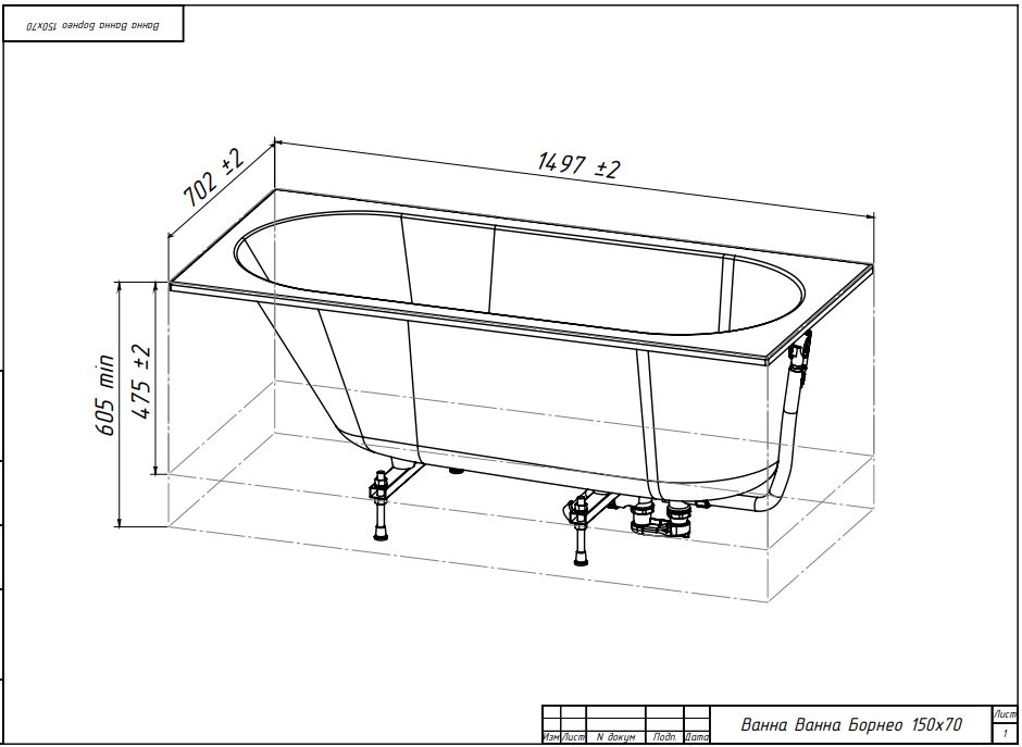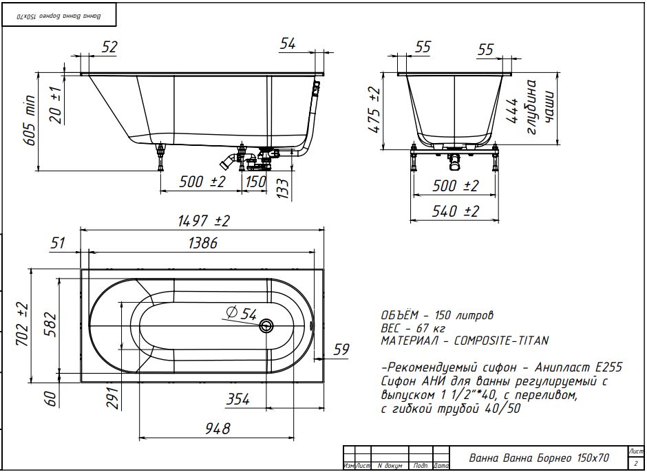 Комплектация ванны Белюкс Борнео 150x70 Белый матовый (18): • ванна • сифон с выпуском • подставка для ванн ПВ-5 • паспорт.