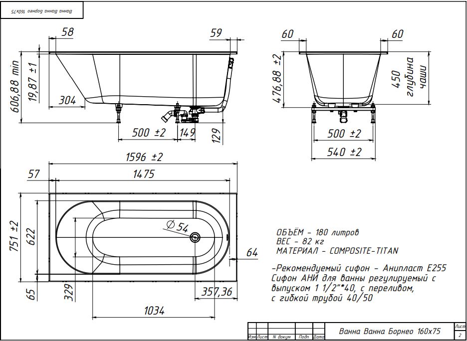 Комплектация ванны Белюкс Борнео 160x75 Solid Surface: • ванна • сифон с выпуском • подставка для ванн ПВ-5 • паспорт.