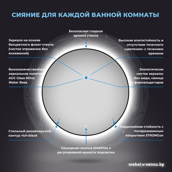 | Информация | 7 Rays' Spectrum — коллекция-бестселлер от Wellsee, в которую включены стильные дизайнерские зеркала, придающие пространству дополнительную глубину. Зеркало с тонким черным контуром станет отличным комплиментом готовому интерьеру и безупречному вкусу владельца. В коллекцию входят актуальные формы и популярные размеры классических зеркал без подсветки и LED-зеркал, среди которых с легкостью можно найти идеальное решение для реализации любых дизайнерских идей. ЗЕРКАЛО ТРЕТЬЕГО ПОКОЛЕНИЯ: AGC GLASS MIROX 3G Безупречное японское стекло — результат непрерывного развития технологий, оно соответствует единой системе защиты от коррозии и точечного «цветения» с течением времени. Периметр зеркального полотна декорирован тонким черным контуром, при облучении которого отверждаемые УФ-чернила значительно повышают прочность сцепления. Мягкая LED-подсветка на стену помогает оживить интерьер, а поток света нейтральной температуры создает воздушный фон для отражения. Прозрачный компаунд защищает электрические диоды от случайных брызг и капель, подчеркивает красоту естественных оттенков, наполняя пространство светом и новыми ощущениями. Светящийся контур мягко обрамляет зеркало, соединяет функциональность со стилем, создавая идеальные условия для ежедневных процедур. Экологически чистое зеркало на основе бесцветного флоат-стекла меняет визуальное восприятие пространства и смещает акценты, делая бледное ярким, а обычное – уникальным! Деликатный минимализм зеркала подчеркивает богатую фактуру отделки стен, демонстрируя непревзойденные преимущества и безграничный простор помещений со светлым интерьером. ЛУЧШИЕ КОНСТРУКТОРСКИЕ РЕШЕНИЯ ДЛЯ ВАШЕГО ДОМА Зеркало с интерьерной подсветкой – простое и удобное решение, которое создает расслабляющую атмосферу в ванной комнате. Плотный поток света от LED-ленты, установленной с обратной стороны полотна, создает равномерный ореол идеальной формы и подчеркивает достоинства умывальной зоны. Функция плавного диммирования позволяет регулировать интенсивность свечения, а контроллер запоминает последнее положение яркости. При легком касании сенсора подсветка включается и выключается, а при длительном нажатии изменяется яркость свечения. За счет тонкой рамы зеркало идеально прилегает к стене и сливается с ее поверхностью, а светодиоды сбоку практически не видны. Заводские металлические крепления надежно удерживают всю конструкцию, а монтажные работы можно выполнить самостоятельно, не прибегая к помощи профессионалов. ЕДИНАЯ УМЫВАЛЬНАЯ ЗОНА С WELLSEE Зеркало 7 Rays' Spectrum идеально дополнит монохромные помещения и ванные комнаты с ярким дизайном. Создать гармоничную композицию в едином стиле помогут оригинальные смесители, надежные сифоны, функциональные донные клапаны и угловые вентили из коллекций Wellsee, которые отлично сочетаются и прекрасно дополняют друг друга. Придать завершенность и расставить акценты можно при помощи лаконичных столешниц и элегантных современных раковин Wellsee, а также стильных аксессуаров Finishing Touch. НАДЕЖНАЯ УПАКОВКА Каждое зеркало тщательно упаковано. Многослойная упаковка из плотного гофрированного картона и пузырчатой пленки защищает все элементы от трещин и сколов, а специальная бумага – от появления микроцарапин на зеркальном полотне. На углы установл