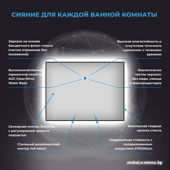 | Информация | 7 Rays' Spectrum — коллекция-бестселлер от Wellsee, в которую включены стильные дизайнерские зеркала, придающие пространству дополнительную глубину. Зеркало с тонким черным контуром станет отличным комплиментом готовому интерьеру и безупречному вкусу владельца. В коллекцию входят актуальные формы и популярные размеры классических зеркал без подсветки и LED-зеркал, среди которых с легкостью можно найти идеальное решение для реализации любых дизайнерских идей. ЗЕРКАЛО ТРЕТЬЕГО ПОКОЛЕНИЯ: AGC GLASS MIROX 3G Безупречное японское стекло — результат непрерывного развития технологий, оно соответствует единой системе защиты от коррозии и точечного «цветения» с течением времени. Периметр зеркального полотна декорирован тонким черным контуром, при облучении которого отверждаемые УФ-чернила значительно повышают прочность сцепления. Мягкая LED-подсветка на стену помогает оживить интерьер, а поток света нейтральной температуры создает воздушный фон для отражения. Прозрачный компаунд защищает электрические диоды от случайных брызг и капель, подчеркивает красоту естественных оттенков, наполняя пространство светом и новыми ощущениями. Светящийся контур мягко обрамляет зеркало, соединяет функциональность со стилем, создавая идеальные условия для ежедневных процедур. Экологически чистое зеркало на основе бесцветного флоат-стекла меняет визуальное восприятие пространства и смещает акценты, делая бледное ярким, а обычное – уникальным! Деликатный минимализм зеркала подчеркивает богатую фактуру отделки стен, демонстрируя непревзойденные преимущества и безграничный простор помещений со светлым интерьером. ЛУЧШИЕ КОНСТРУКТОРСКИЕ РЕШЕНИЯ ДЛЯ ВАШЕГО ДОМА Зеркало с интерьерной подсветкой – простое и удобное решение, которое создает расслабляющую атмосферу в ванной комнате. Плотный поток света от LED-ленты, установленной с обратной стороны полотна, создает равномерный ореол идеальной формы и подчеркивает достоинства умывальной зоны. Функция плавного диммирования позволяет регулировать интенсивность свечения, а контроллер запоминает последнее положение яркости. При легком касании сенсора подсветка включается и выключается, а при длительном нажатии изменяется яркость свечения. За счет тонкой рамы зеркало идеально прилегает к стене и сливается с ее поверхностью, а светодиоды сбоку практически не видны. Заводские металлические крепления надежно удерживают всю конструкцию, а монтажные работы можно выполнить самостоятельно, не прибегая к помощи профессионалов. ЕДИНАЯ УМЫВАЛЬНАЯ ЗОНА С WELLSEE Зеркало 7 Rays' Spectrum идеально дополнит монохромные помещения и ванные комнаты с ярким дизайном. Создать гармоничную композицию в едином стиле помогут оригинальные смесители, надежные сифоны, функциональные донные клапаны и угловые вентили из коллекций Wellsee, которые отлично сочетаются и прекрасно дополняют друг друга. Придать завершенность и расставить акценты можно при помощи лаконичных столешниц и элегантных современных раковин Wellsee, а также стильных аксессуаров Finishing Touch. НАДЕЖНАЯ УПАКОВКА Каждое зеркало тщательно упаковано. Многослойная упаковка из плотного гофрированного картона и пузырчатой пленки защищает все элементы от трещин и сколов, а специальная бумага – от появления микроцарапин на зеркальном полотне. На углы установл