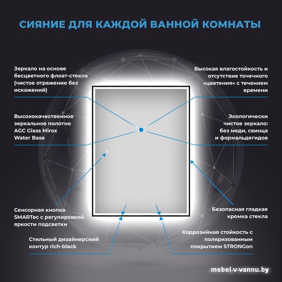 | Информация | 7 Rays' Spectrum — коллекция-бестселлер от Wellsee, в которую включены стильные дизайнерские зеркала, придающие пространству дополнительную глубину. Зеркало с тонким черным контуром станет отличным комплиментом готовому интерьеру и безупречному вкусу владельца. В коллекцию входят актуальные формы и популярные размеры классических зеркал без подсветки и LED-зеркал, среди которых с легкостью можно найти идеальное решение для реализации любых дизайнерских идей. ЗЕРКАЛО ТРЕТЬЕГО ПОКОЛЕНИЯ: AGC GLASS MIROX 3G Безупречное японское стекло — результат непрерывного развития технологий, оно соответствует единой системе защиты от коррозии и точечного «цветения» с течением времени. Периметр зеркального полотна декорирован тонким черным контуром, при облучении которого отверждаемые УФ-чернила значительно повышают прочность сцепления. Основное отличие фронтальной подсветки от фоновой заключается в пескоструйной обработке намеченного участка изделия. После такой обработки стекла равномерно яркий поток света заполняет матовую полосу на зеркальной поверхности, что позволяет легко наносить макияж и удобно укладывать волосы девушкам или аккуратно бриться мужчинам. Экологически чистое зеркало на основе бесцветного флоат-стекла меняет визуальное восприятие пространства и смещает акценты, делая бледное ярким, а обычное – уникальным! Прозрачный компаунд защищает электрические диоды от случайных брызг и капель, подчеркивает красоту естественных оттенков, наполняя пространство светом и новыми ощущениями. ЛУЧШИЕ КОНСТРУКТОРСКИЕ РЕШЕНИЯ ДЛЯ ВАШЕГО ДОМА В зеркале с интерьерной и фронтальной подсветкой функциональность гармонично соединена с дизайном. Двойной сияющий контур дает еще больше света, превращая зеркало в самостоятельный источник освещения с собственным сценарием свечения. Интерьерная подсветка, обрамляя зеркало по периметру, наполняет пространство светом и придает конструкции легкость. Фронтальный свет создает рассеянный комфортный для глаз поток, позволяющий рассмотреть каждую деталь отражения во время гигиенических и косметологических процедур для достижения идеального результата. Функция плавного диммирования позволяет регулировать интенсивность свечения, а контроллер запоминает последнее положение яркости. При легком касании сенсора подсветка включается или выключается, а при длительном нажатии изменяется яркость свечения. За счет тонкой рамы зеркало идеально прилегает к стене и сливается с ее поверхностью, а светодиоды сбоку практически не видны. Заводские металлические крепления надежно удерживают всю конструкцию, монтажные работы можно выполнить самостоятельно, не прибегая к помощи профессионалов. ЕДИНАЯ УМЫВАЛЬНАЯ ЗОНА С WELLSEE Зеркало 7 Rays' Spectrum идеально дополнит монохромные помещения и ванные комнаты с ярким дизайном. Создать гармоничную композицию в едином стиле помогут оригинальные смесители, надежные сифоны, функциональные донные клапаны и угловые вентили из коллекций Wellsee, которые отлично сочетаются и прекрасно дополняют друг друга. Придать завершенность и расставить акценты можно при помощи лаконичных столешниц и элегантных современных раковин Wellsee, а также стильных аксессуаров Finishing Touch. НАДЕЖНАЯ УПАКОВКА Каждое зеркало тщательно упаковано. Многослойная упаковка из плотного го