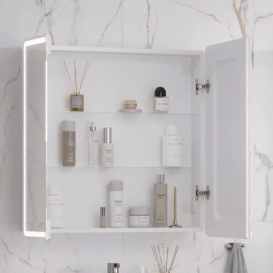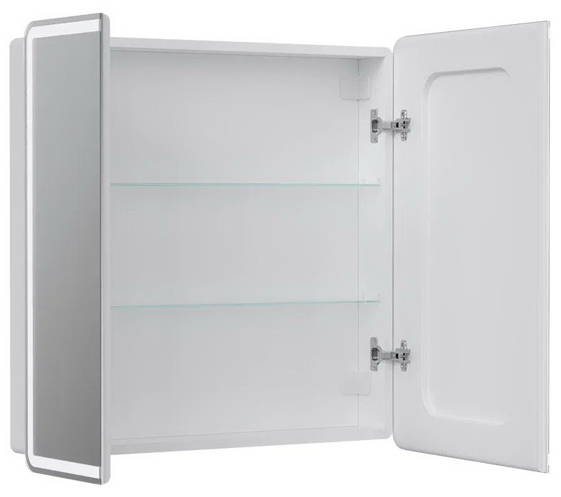 Конструкция: Зеркальный шкаф в ванную EQUIL NICE LED 80, с двумя стеклянными полками за распашными дверцами.