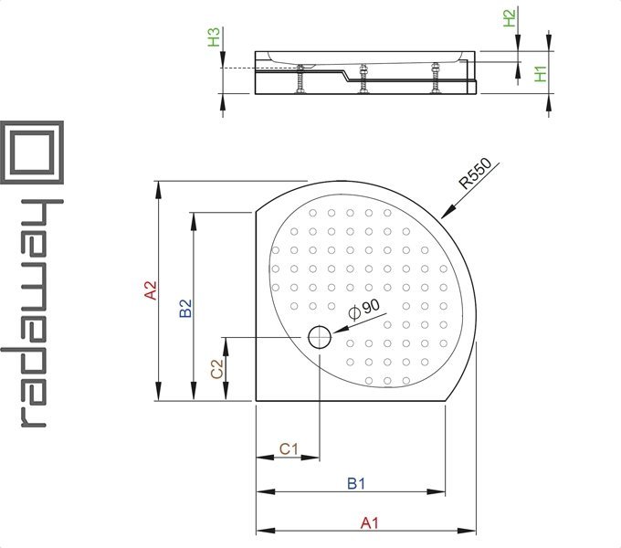 Купить для ванной в Минске с доставкой по Беларуси: Душевой поддон RODOS B, Radaway, Pl., Полукруглый поддон Тип В, цельнолитый с ножками. Отверстие под сифон Ø90. Рекомендуемые сифоны: TB90, TB21, 690. table td:first-child {text-align: left;}.tftable {font-size:2px; border: 0px; border-collapse: collapse;}.tftable th {font-size:14px;color:white;background-color:#6389a3;border-width: 1px; padding: 2px;border-style: solid;text-align:center;}.tftable tr {background-color:white; fontcolor:black;}.tftable td {font-size:14px; border-width: 1px;padding: 1px;border-style: solid;text-align:center;}.tftable tr:hover {background-color:#e36c0a;}            RODOS B        A1        A2        B1    B2    C1    C2    H1    H2    H3                910×910        910        910        780        780        270        270        165        20        80         Гарантия 3 года от завода Производителя. Производитель: Radaway Ltd.Jasin, Rabowicka 59 Street62-020 Swarzedz.