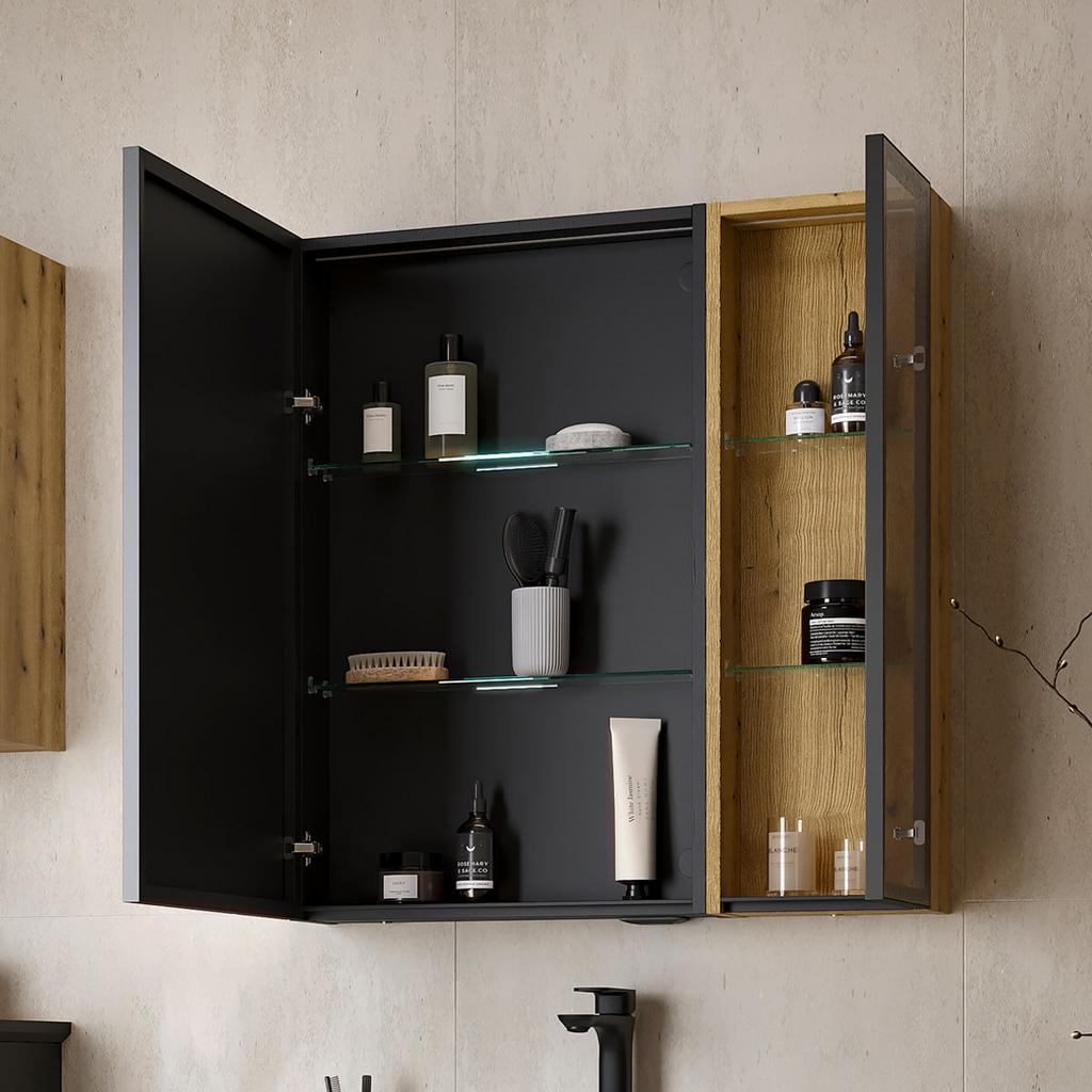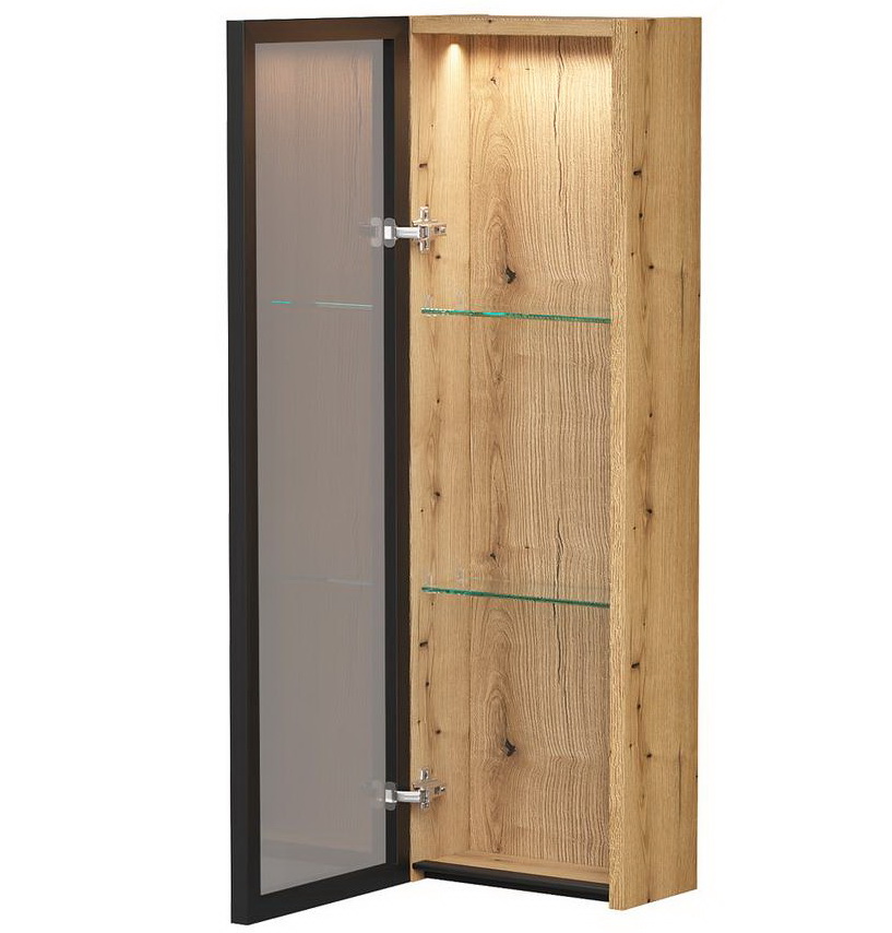 Конструкция: стеклянный шкаф в ванную EQUIL Strong 25.1D, с нейтральной внутренней LED-подсветкой.