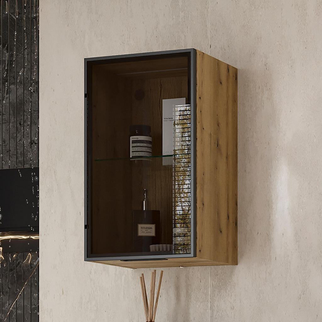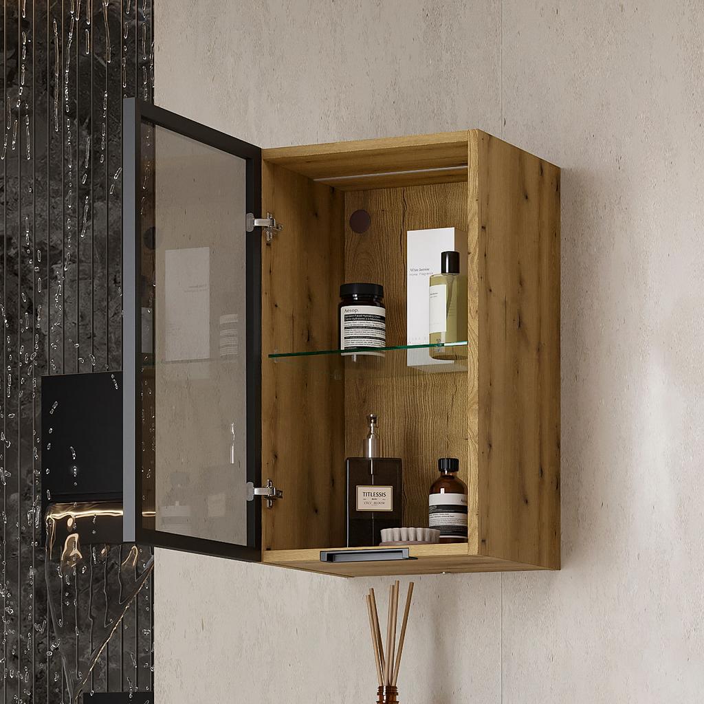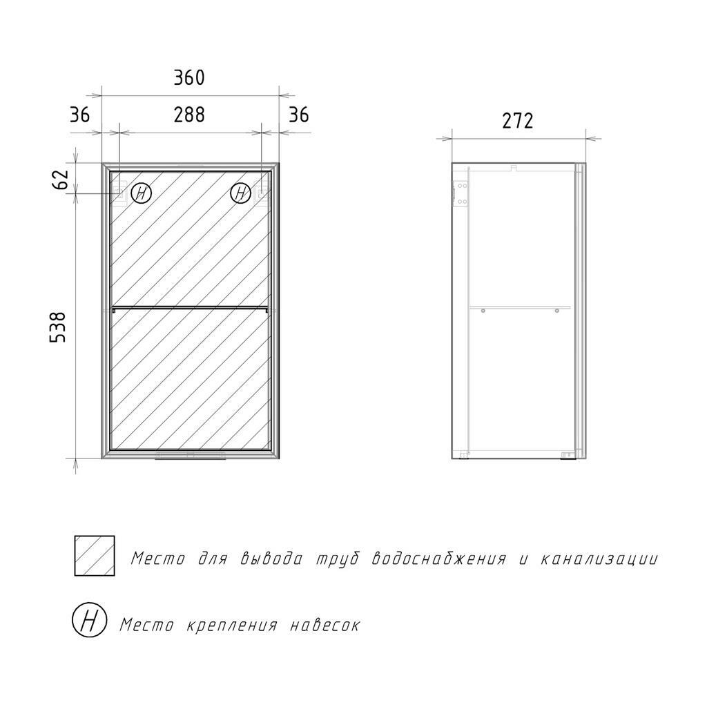 Минипенал подвесной Strong 36 изготовлен из влагостойких материалов: фасад – из закаленного тонированного стекла в алюминиевом профиле с анодированным покрытием, корпус из ЛДСП, петли оснащены доводчиками.