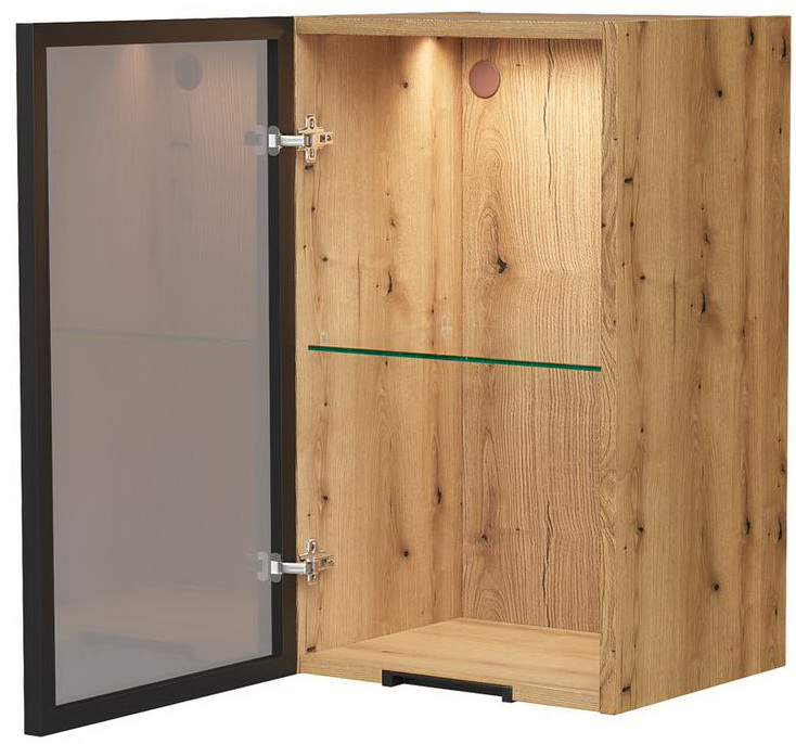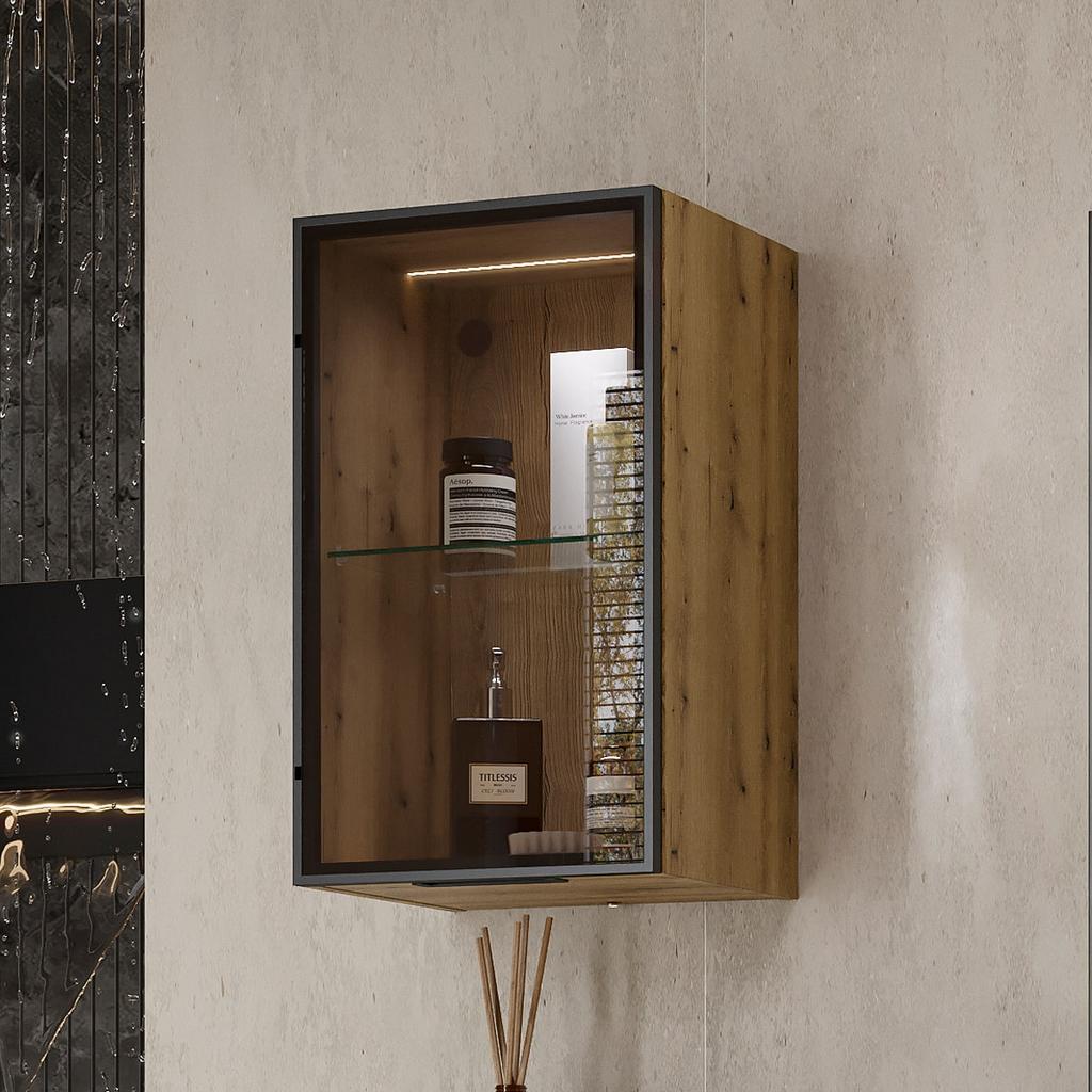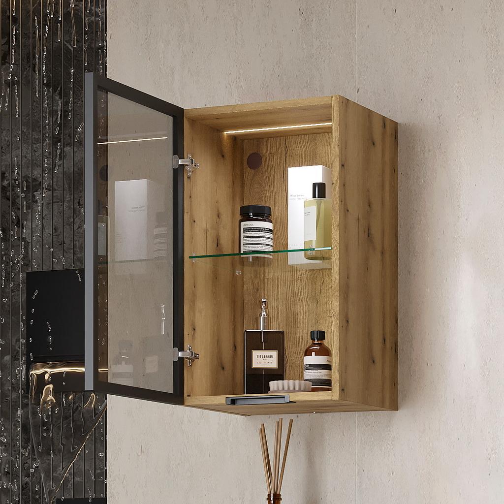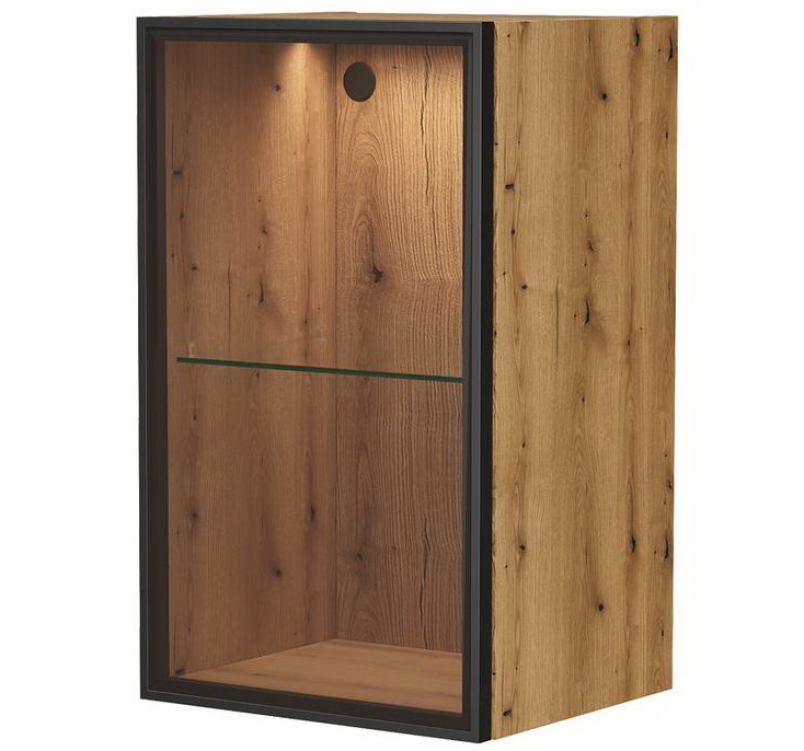 Минипенал подвесной Strong 36 изготовлен из влагостойких материалов: фасад – из закаленного тонированного стекла в алюминиевом профиле с анодированным покрытием, корпус из ЛДСП, петли оснащены доводчиками.