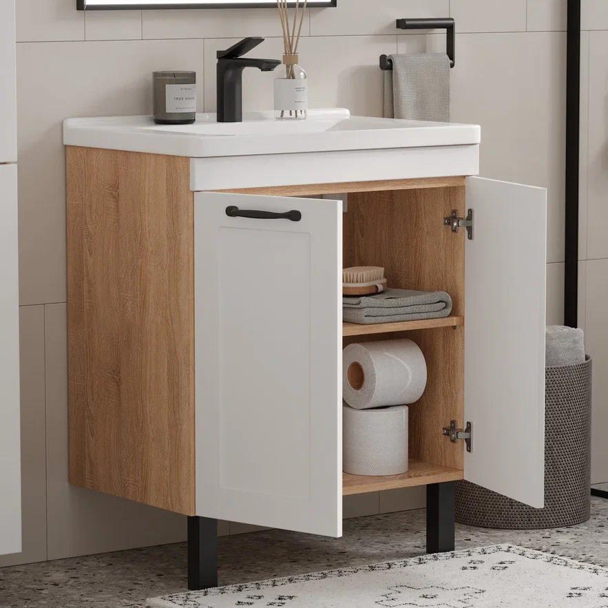 Напольная модель с лаконичной фрезеровкой на фасадах, выполненная в сочетании белого матового цвета и текстуры дерева.