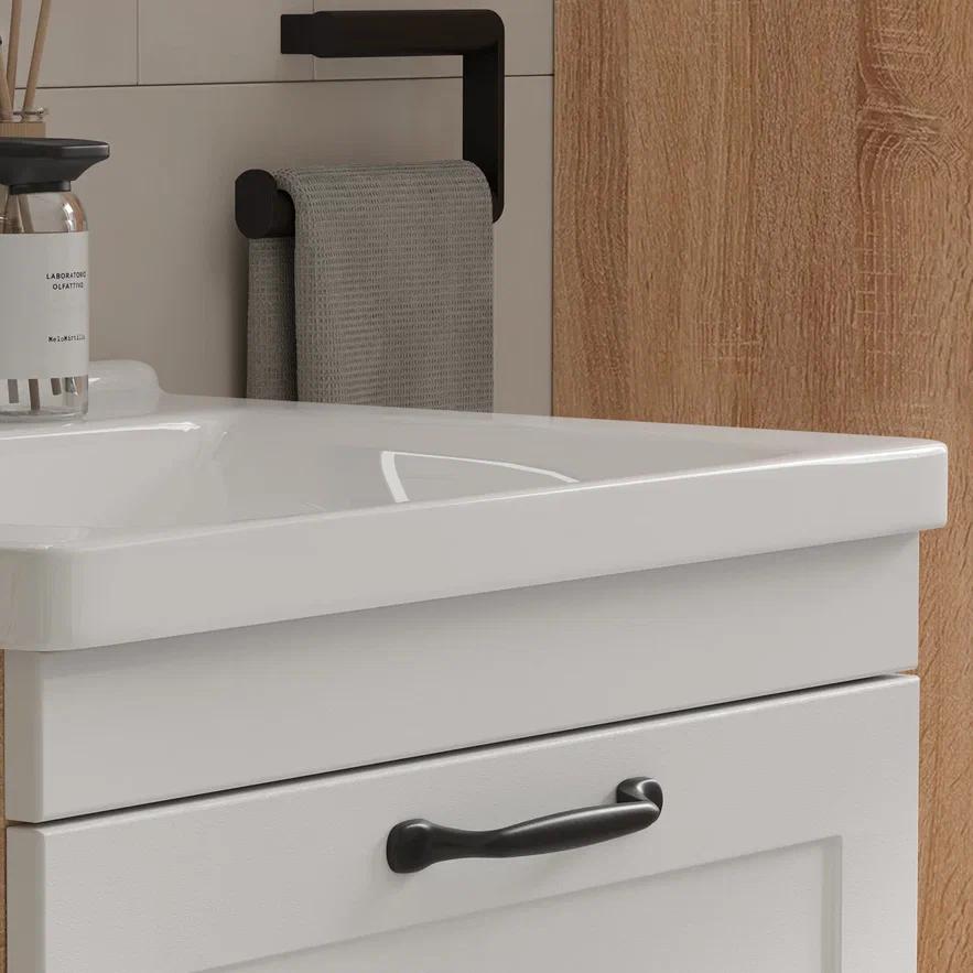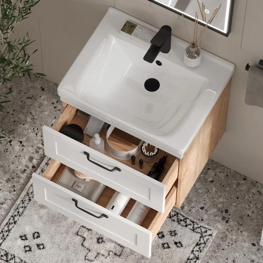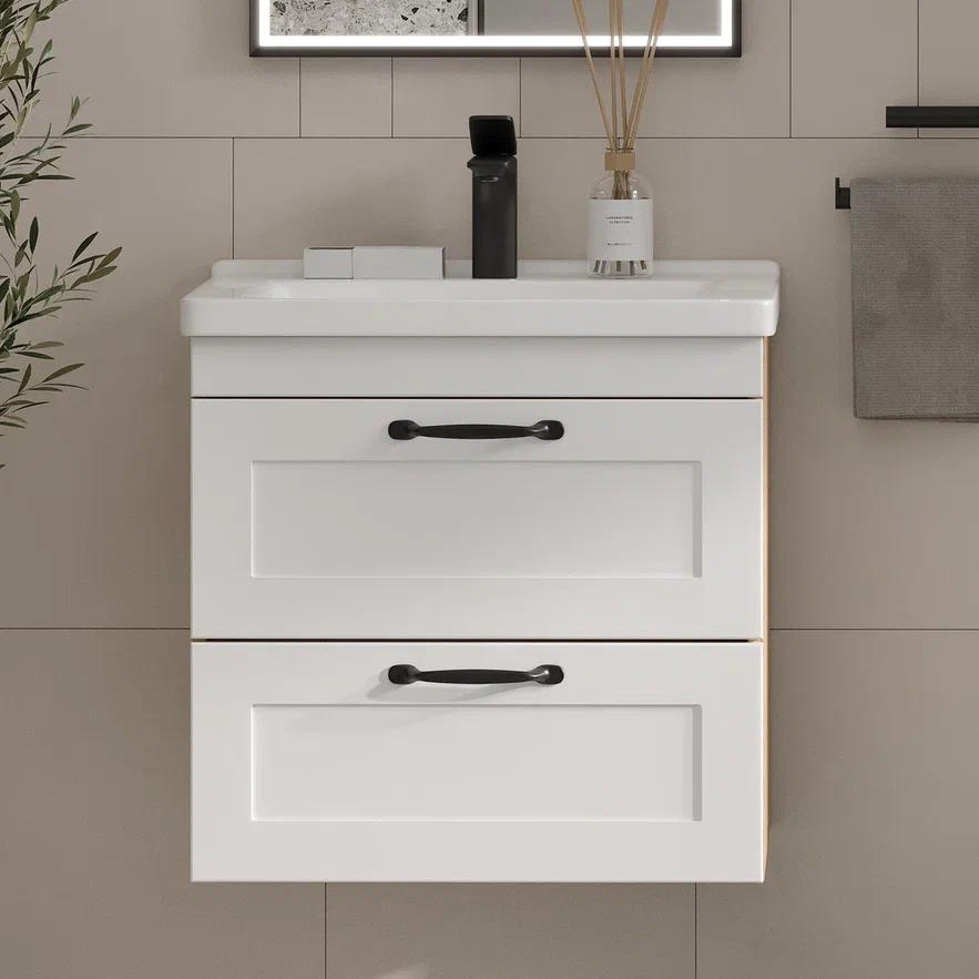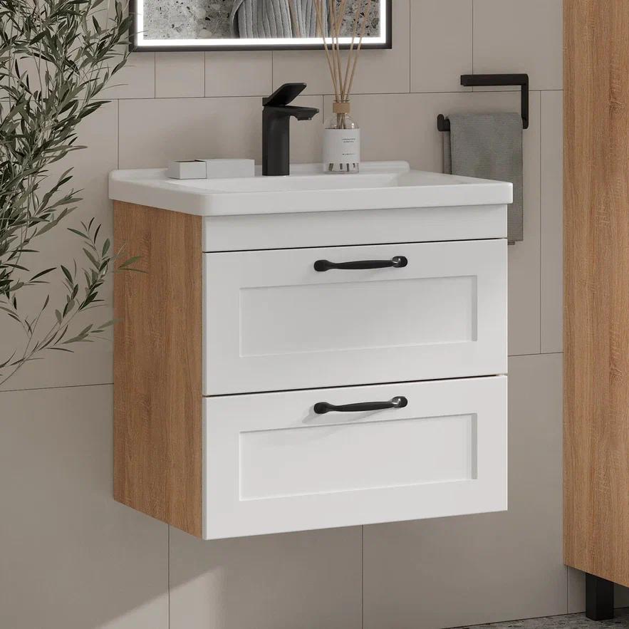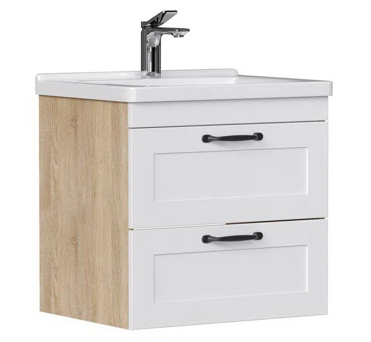 Конструкция: Подвесные тумбы с двумя выдвижными ящиками в цвете белый/дуб сонома под раковину из керамики.