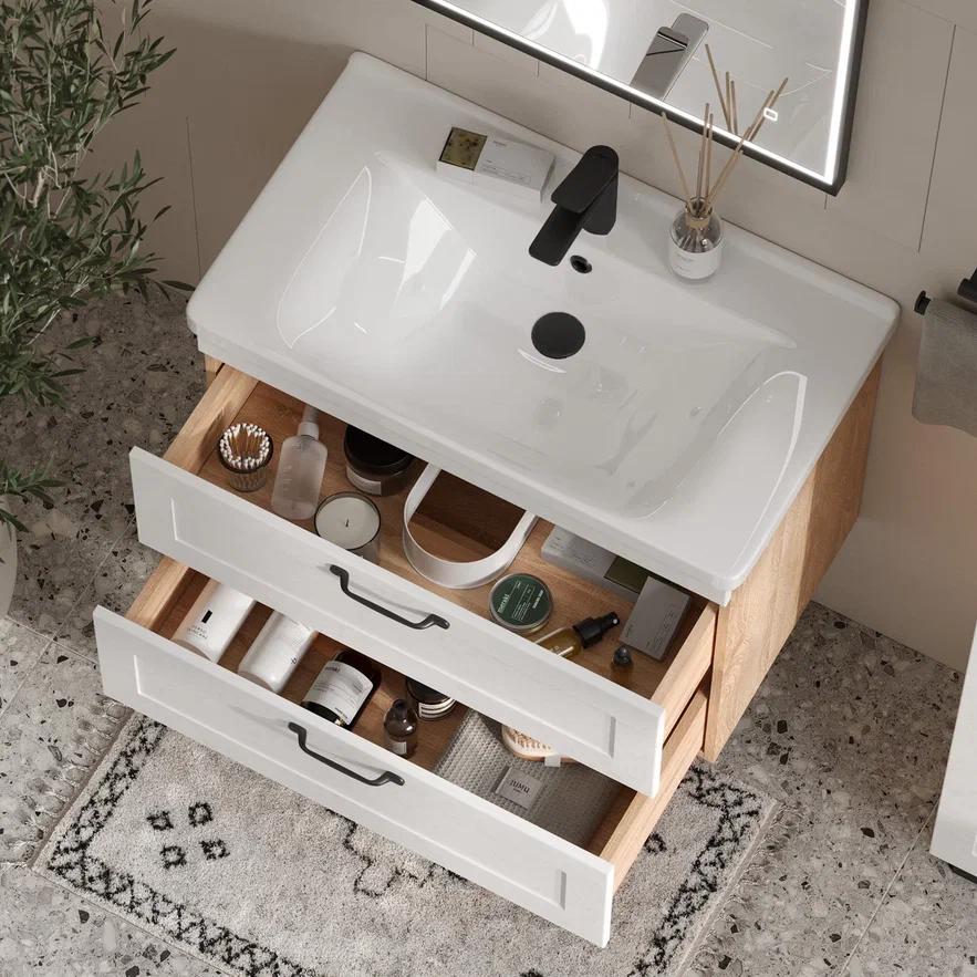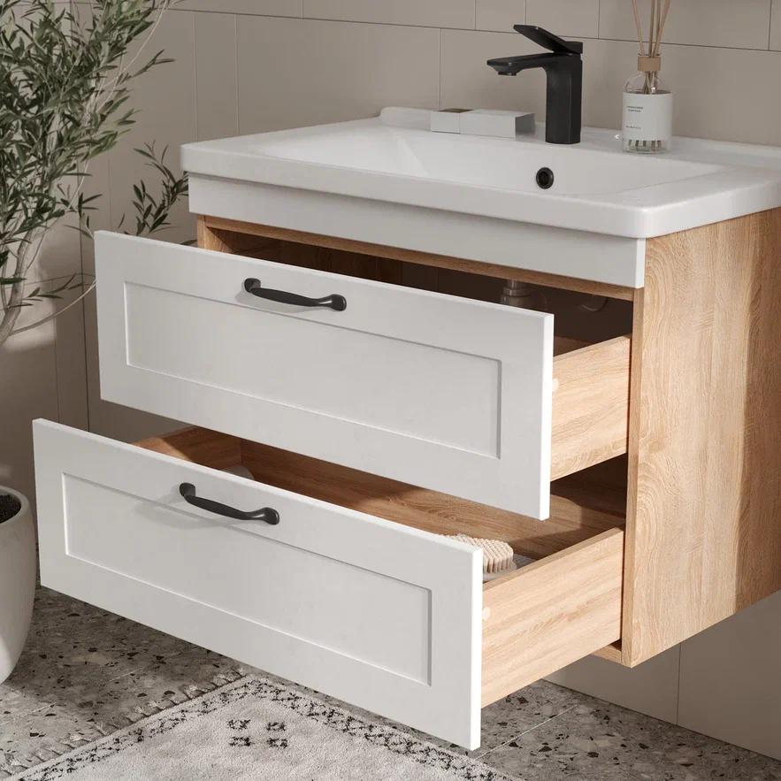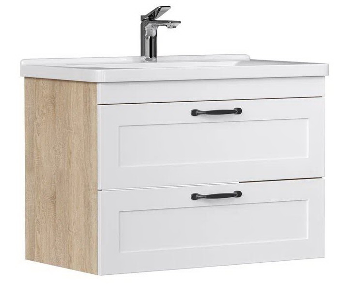 Конструкция: Подвесные тумбы с двумя выдвижными ящиками в цвете белый/дуб сонома под раковину из керамики.
