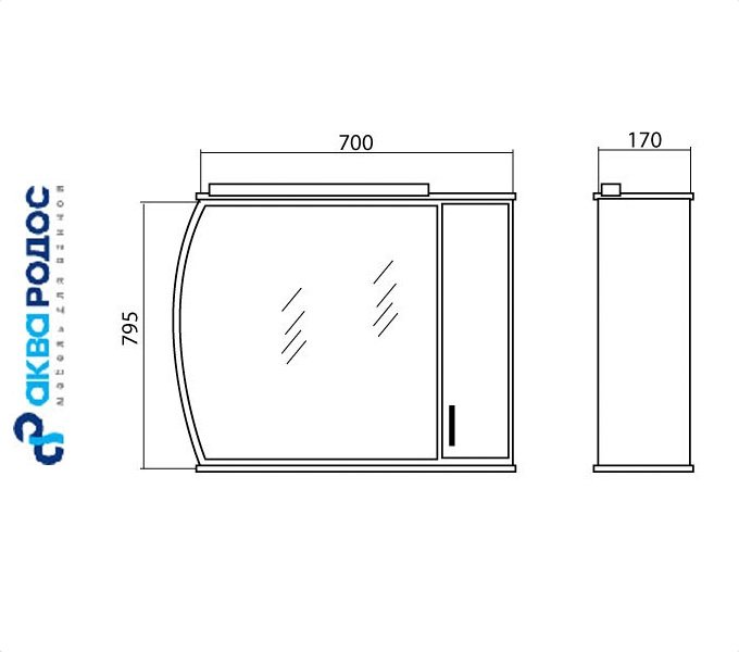Купить для ванной в Минске с доставкой по Беларуси: Зеркало ДЕКОР 70 (R) в ванную комнату, АкваРодос, Украина, зеркало с полкой, со шкафчиком, с подсветкой, в*ш*г, 795*700*170. Гарантия 2 года от завода Производителя. • Фасады из 19 мм МДФ производства «Kronospan» (Польша); корпус – ДСП «Egger» (Австрия). Материалы устойчивы к переменам влажности, температурным режимам. • Фасады и боковые части мебели покрыты тремя слоями грунта и окрашены двумя слоями полиуретановой краски производства «ICA» (Италия). • Фурнитура «Blum» (Австрия), «Hettich» (Германия), с системой плавного закрывания –  80 000 циклов открывания-закрывания, имеет сертификат качества ISO 9000:2001. • Зеркальные полотна толщиной 4 мм произведены Бельгийской компанией «Glaverbell». • Светильники Испанской фирмы «Ebir». Производитель: ООО «Аква Родос», Республика Украина, 30000, Украина, Хмельницкая обл., г. Славута, ул. Козацкая 122а.