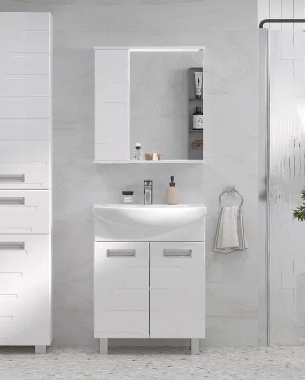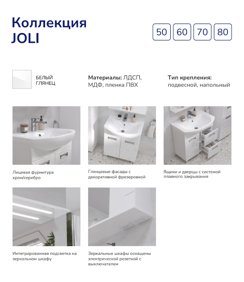 Шкаф с зеркалом Joli 50 изготовлен из влагостойких материалов: Фасад из МДФ, покрыт глянцевой пленкой ПВХ, корпус из ЛДСП.
