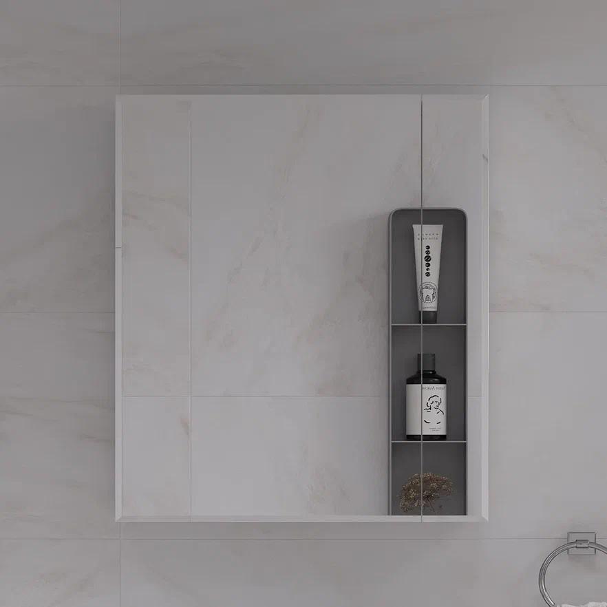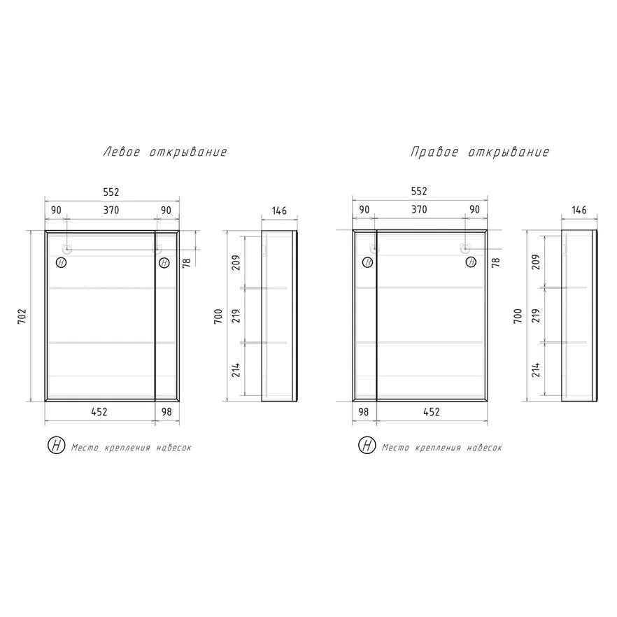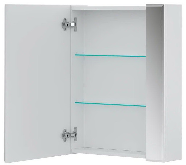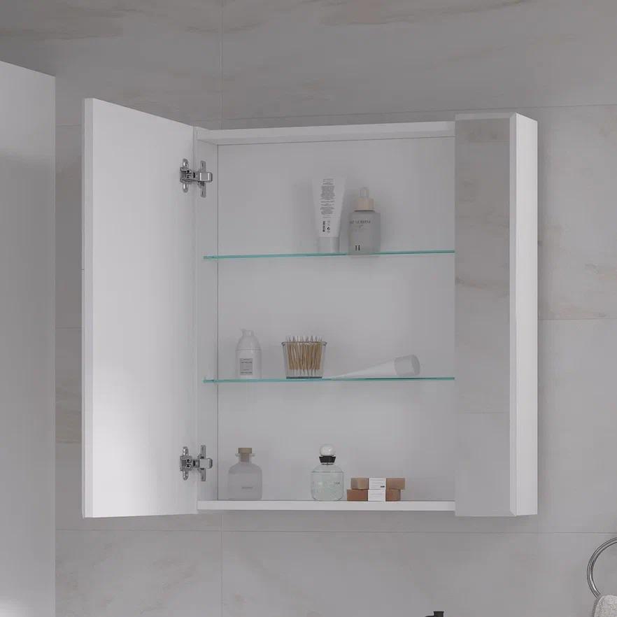 Конструкция: Зеркальный шкаф в ванную VOLNA Joli 55, с двумя стеклянными полками за распашной дверцей.
