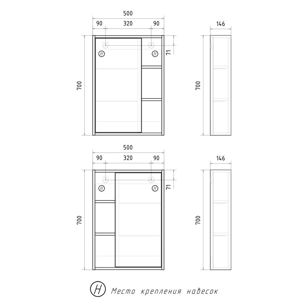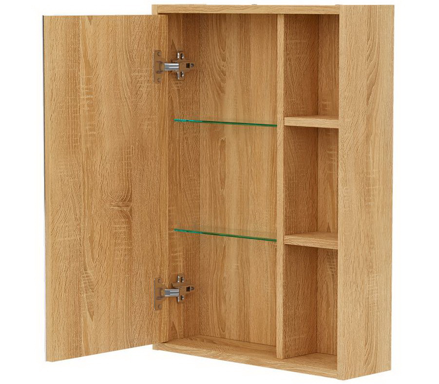 Конструкция: Зеркальный шкаф в ванную VOLNA Osmond 50, одна распашная дверь с плавным закрыванием (доводчики), внутри две полки, сбоку открытые полки, без подсветки.
