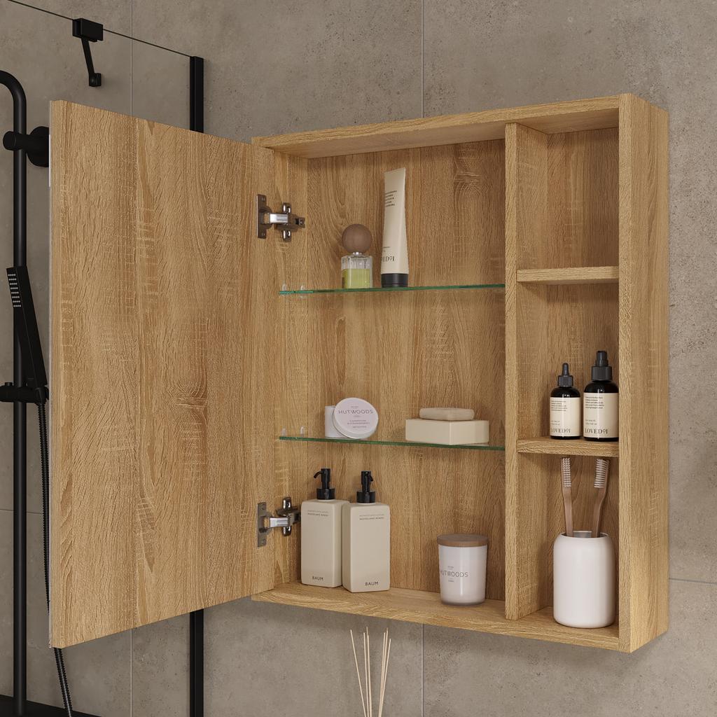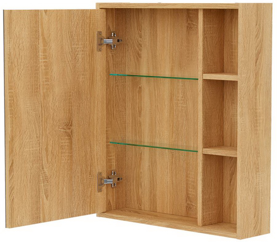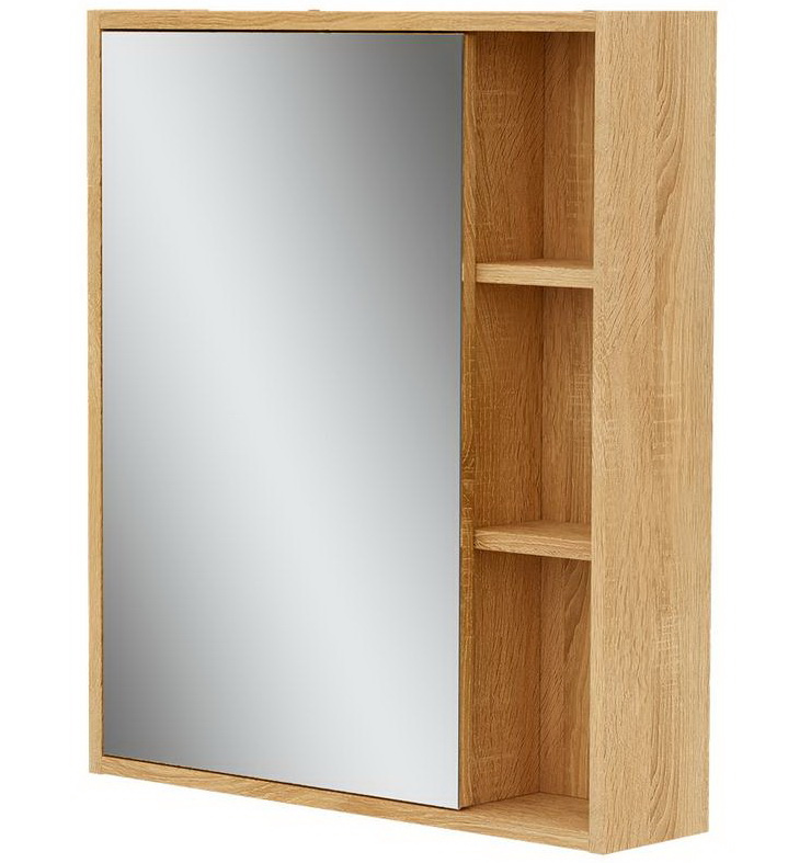 Конструкция: Зеркальный шкаф в ванную VOLNA Osmond 60, одна распашная дверь с плавным закрыванием (доводчики), внутри две полки, сбоку открытые полки, без подсветки.
