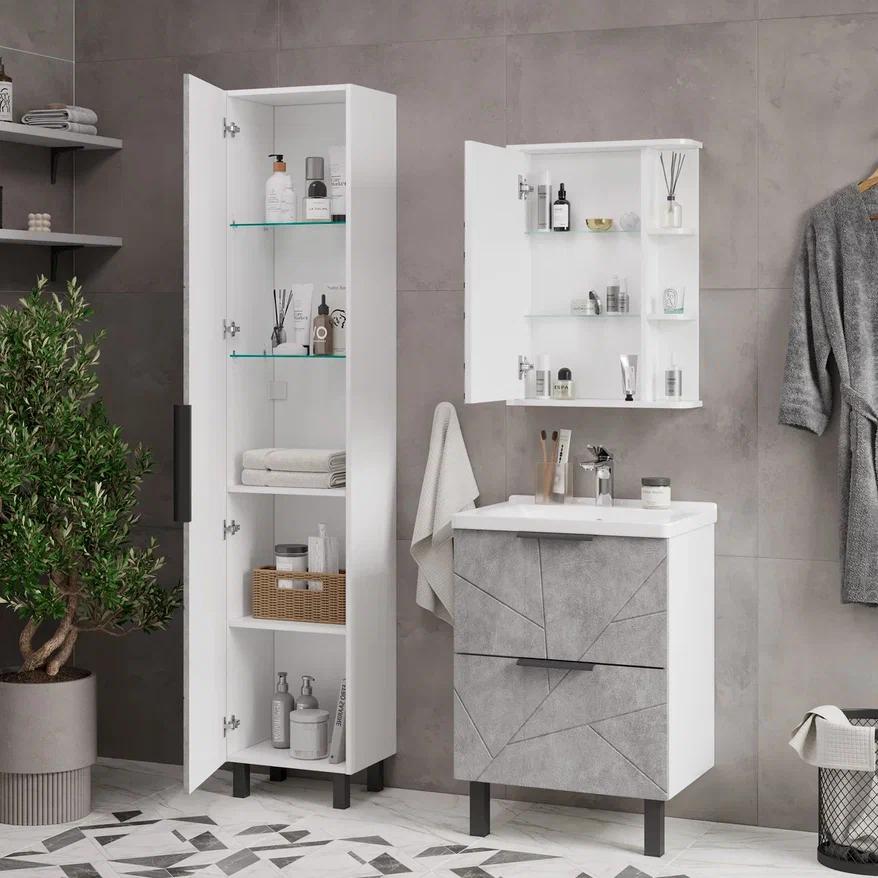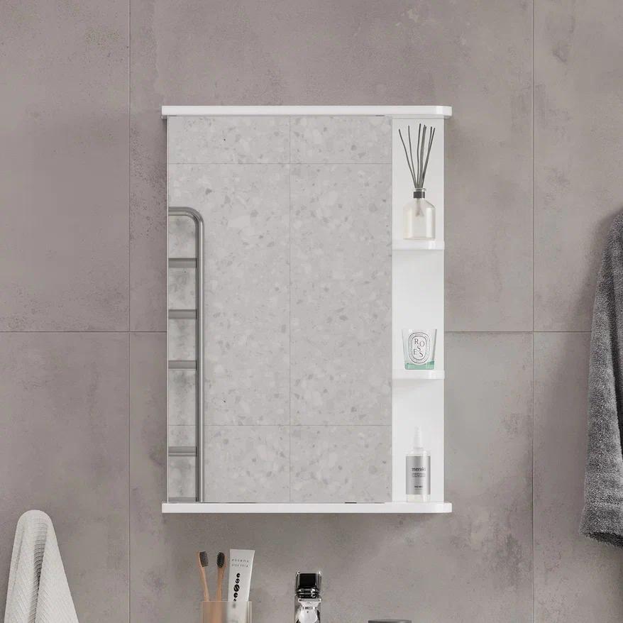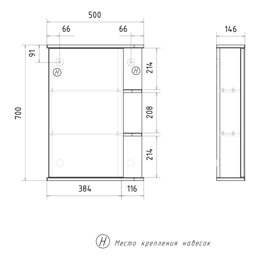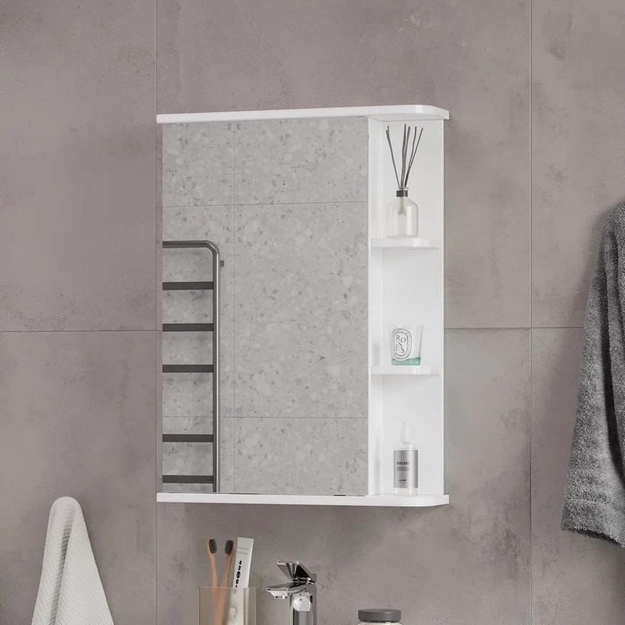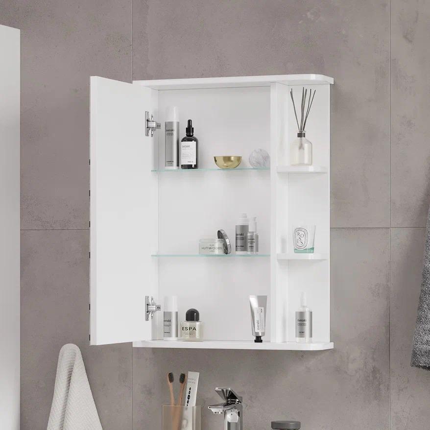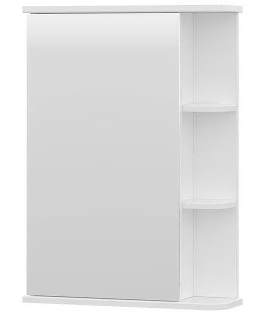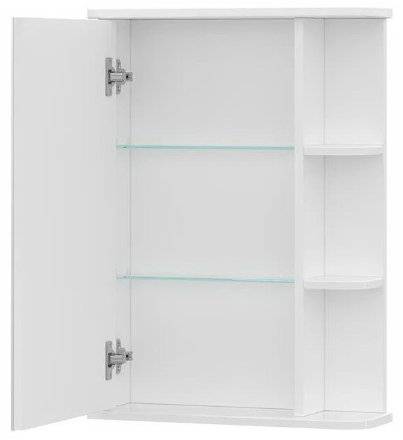 Конструкция: Зеркальный шкаф в ванную VOLNA Twing 50, с открытыми полками, распашной дверцей и стеклянными полками внутри.