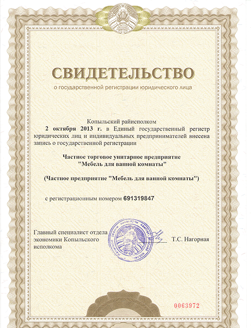 2 Октября 2013 г. в Единый государственный регистр юридических лиц и индивидуальных предпринимателей внесена запись о государственной регистрации Частное торговое унитарное предприятие "Мебель для ванной комнаты" с регистрационным номером 691319847 и выдано Свидетельство 0063972.